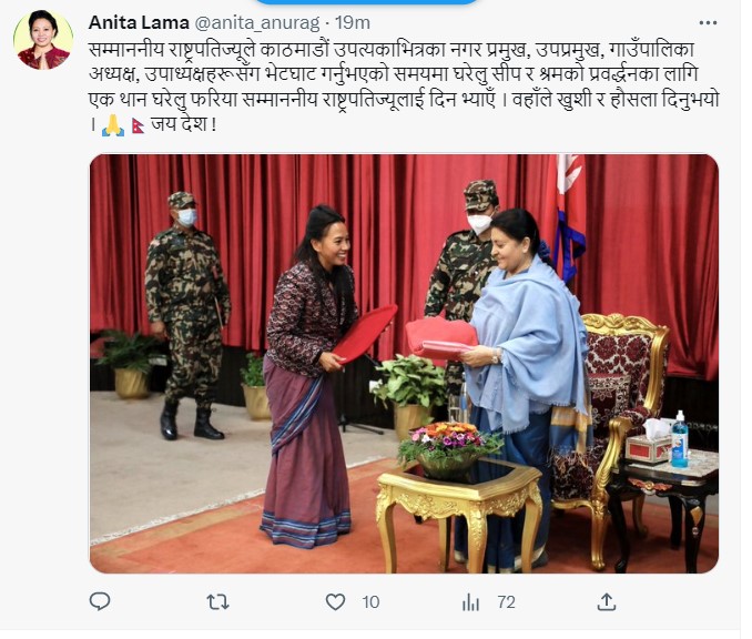 उनले घरेलु सीप र श्रमको प्रवर्द्धनका लागि एक थान घरेलु फरिया उपहार दिएको बताएकी छिन । अनितले ट्वीटमा भनेकी छिन, ‘सम्माननीय राष्ट्रपतिज्यूले काठमाडौं उपत्यकाभित्रका नगर प्रमुख, उपप्रमुख, गाउँपालिका अध्यक्ष, उपाध्यक्षहरूसँग भेटघाट गर्नुभएको समयमा घरेलु सीप र श्रमको प्रवर्द्धनका लागि एक थान घरेलु फरिया सम्माननीय राष्ट्रपतिज्यूलाई दिन भ्याएँ । वहाँले खुशी र हौसला दिनुभयो । 🙏🇳🇵जय देश !’