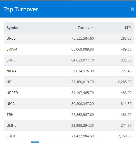 आज २६२ कम्पनीको ३९ लाख ४६ हजार २४ कित्ता सेयर किनबेच हुदाँ १ अर्ब ३८ करोड ७८ लाख ६५ हजार ५१५ रुपैयाँको कारोबार भएको छ । मंगलबार युनिभर्सल पावर कम्पनीको सर्वाधिक काराेबार भएकाे छ । कम्पनीकाे यस दिन ७ करोड ५५ लाख रुपैयाँमाथिको कारोबार भएको छ ।