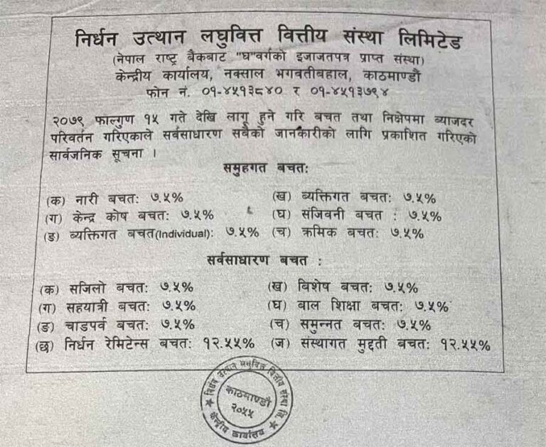 निर्धन उत्थान लघुवित्तले सार्वजनिक गर्याे नयाँ ब्याजदर, कुन बचतमा कति ?