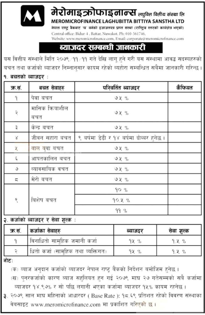 मेरो माइक्रोफाइनान्सको नयाँ ब्याजदर सार्वजनिक