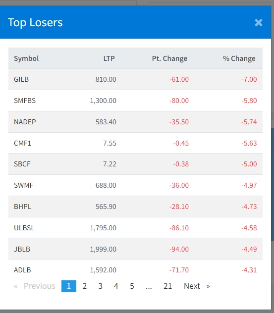 १८ फागुन, काठमाडाैं । साताकाे अन्तिम काराेबारकाे दिन बिहीबार पनि सेयर बजारमा गिरावट आएकाे छ । नेपाल स्टक एक्सचेञ्ज (नेप्से) २६.४८ अकंले घटेर १९६९.०१ बिन्दुमा बन्द भएको छ । सेयर बजार घटेसँगै आज कारोबार रकम समेत घटेर छ ।