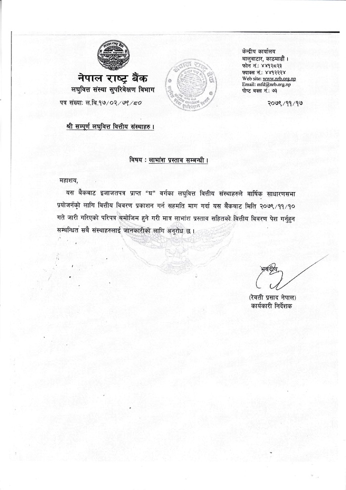 परिपत्रबमोजिम लाभांश प्रस्ताव गर्न लघुवित्तहरुलाई राष्ट्र बैंकको निर्देशन