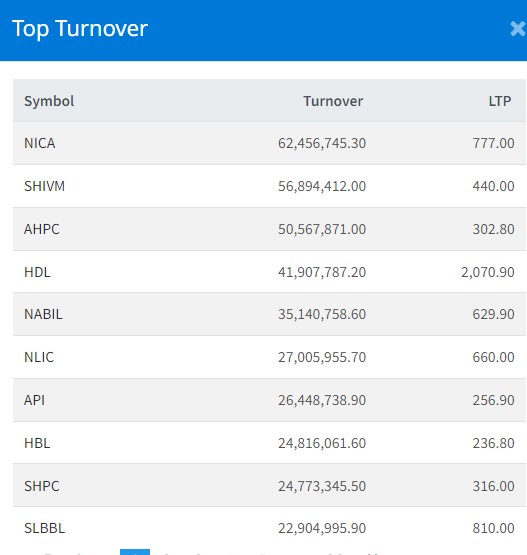त्यस्तै, शिवम् सिमेन्ट्सको ५ करोड ६८ लाख, अरुण भ्याली हाइड्रोपावरको ५ करोड ५ लाख, हिमालयन डिष्टिलरीको ४ करोड १९ लाख रुपैयाँ र नबिल बैंकको ३ करोड ५१ लाख रुपैयाँमाथिको कारोबार भएको छ ।