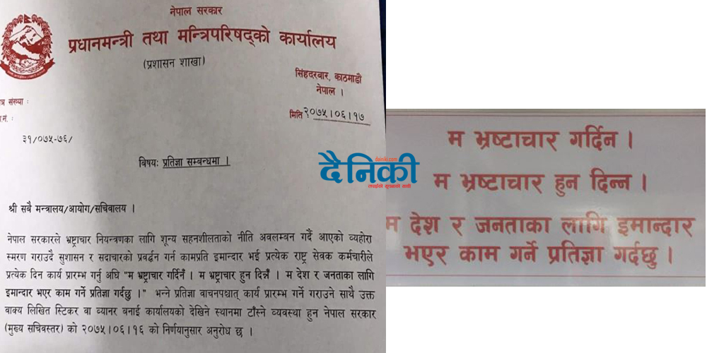 प्रधानमन्त्री तथा मन्त्रिपरिषद्को कार्यालयले एक विज्ञप्ति जारी गर्दै त्यस्तो प्रतिज्ञा लेखिएका स्टिकर वा ब्यानर बनाई कार्यालयमा देखिने स्थानमा टाँस्ने व्यवस्था गर्नसमेत सम्बन्धित सबै सरकारी कार्यालयलाई निर्देशन दिएको छ। प्रधानमन्त्री कार्यालयमा भने केही साता अघिदेखि नै उक्त व्यानगर टाँगिएको थियो ।