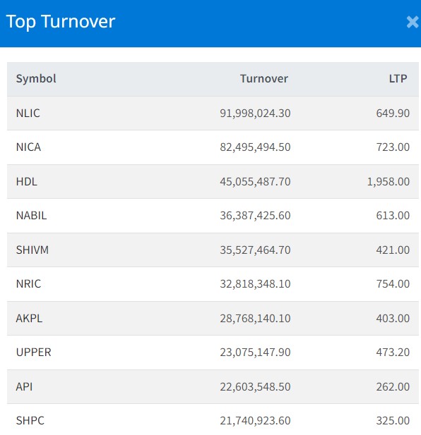 नेप्से घटेसँगै आज सेयर बजारमा एक अर्ब ३३ करोड ३७ लाख रुपैयाँ बढीकाे कारोबार भएको छ । आज नेपाल लाइफ इन्स्योरेन्सको सर्वाधिक काराेबार भएकाे छ । यस दिन कम्पनीकाे ९ करोड १९ लाख रुपैयाँमाथिको कारोबार भएको छ ।