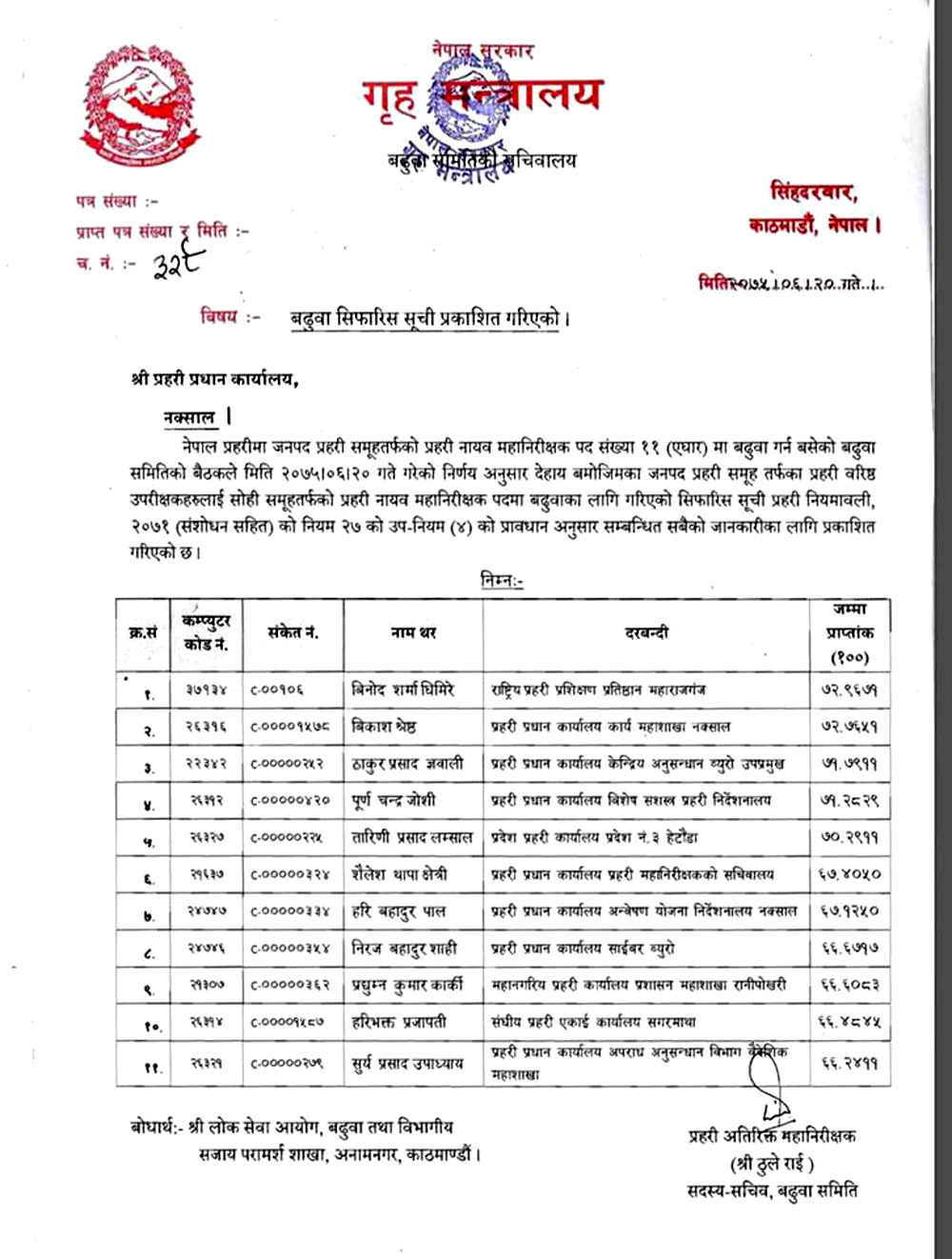 समितिले हालका अाइजीपी सर्वेन्द्र खनालसँगै भर्ना भएकाे टाेलीका एसएसपी बिनाेद शर्मा घिमिरेलार्इ एक नम्बर बरियतामा बढुवा सिफारिस गरेकाे छ। बढुवा सिफारिसमा हालका प्रहरी प्रवक्ता शैलेश थापा क्षेत्री ६ नम्बरमा बढुवामा परेका छन ।