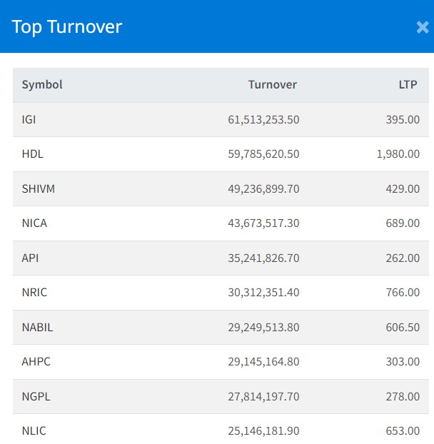 साथै, यस दिन हिमालयन डिष्टिलरीको ५ करोड ९७ लाख, शिवम् सिमेन्ट्सको ४ करोड ९२ लाख, एनआइसी एशिया बैंकको ४ करोड ३६ लाख र अपि पावर कम्पनीको ३ करोड ५२ लाख रुपैयाँमाथिको कारोबार भएको छ ।