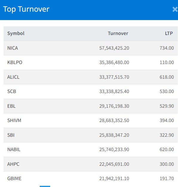 आज एनआइसी एशिया बैंकको सर्वाधिक काराेबार भएकाे छ । कम्पनीकाे यस दिन ५ करोड ७५ लाख रुपैयाँमाथिको कारोबार भएको हाे ।त्यस्तै, कुमारी बैंकको ३ करोड ७५ लाख, एशियन लाइफ इन्स्योरेन्सको ३ करोड ३३ लाख, स्ट्याण्डर्ड चार्टर्ड बैंकको ३ करोड ३३ लाख र एभरेष्ट बैंकको २ करोड ९१ लाख रुपैयाँमाथिको कारोबार भएको छ ।