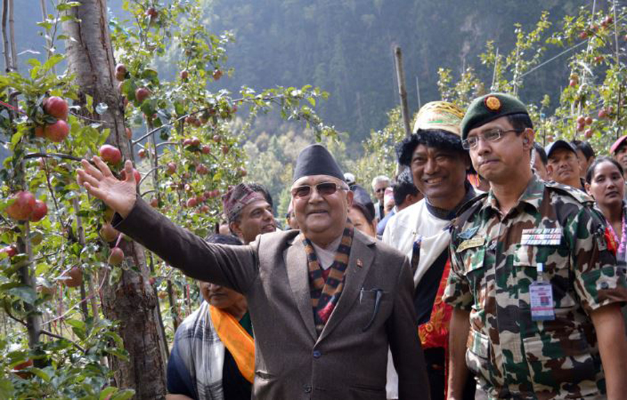 उनले सरकारले यो वर्ष स्याउ कृषकका लागि रु १० करोड अनुदान दिएको र एक लाख स्याउ बिरुवा वितरण गर्ने योजना रहेको बताए ।अर्को प्रसङ्गमा प्रधानमन्त्री ओलीले सुशासन र विकासको बाटोबाट समृद्ध नेपाल र सुखी नेपाली बनाउने सरकारको लक्ष्य रहेको भन्दै विकट र असुरक्षित स्थानमा विकास गर्न कठिनाइ हुने भएकाले त्यस्ता बस्तीलाई सारेर एकीकृत बस्ती बनाउनुपर्नेमा जोड दिए ।