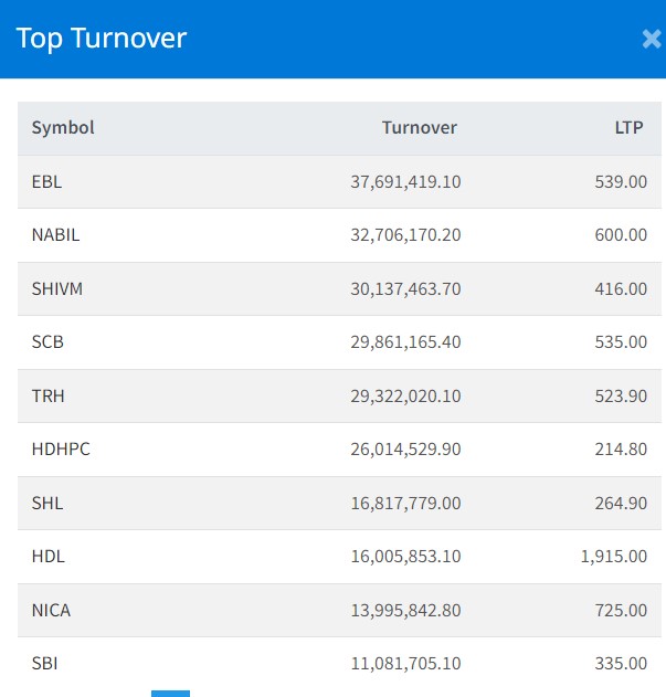 त्यस्तै, नबिल बैंकको ३ करोड २७ लाख रुपैयाँ, शिवम् सिमेन्ट्सको ३ करोड १ लाख, स्ट्याण्डर्ड चार्टर्ड बैंकको २ करोड ९८ लाख, तारागाउँ रिजेन्सी होटलको २ करोड ९३ लाख रुपैयाँमाथिको कारोबार भएको छ ।
