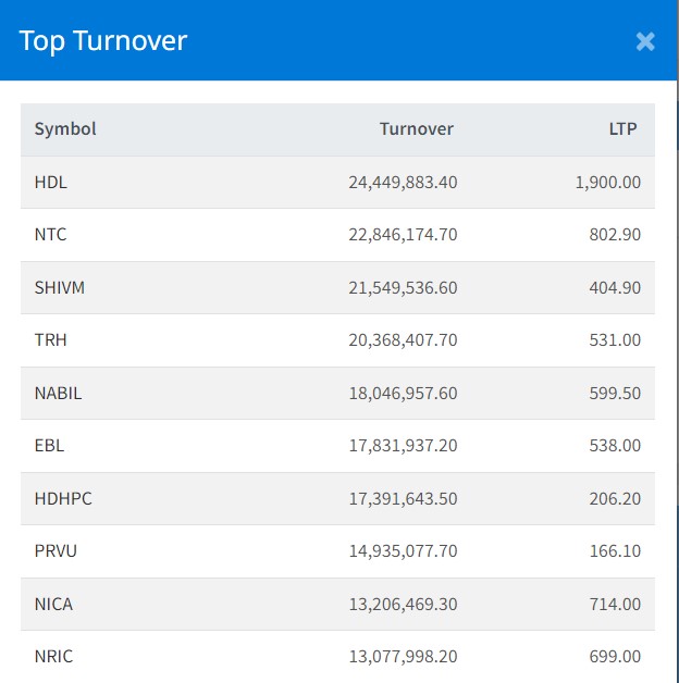 हिमालयन डिष्टिलरीको सर्वाधिक काराेबार भएकाे छ । कम्पनीकाे यस दिन २ करोड ४४ लाख रुपैयाँमाथिको कारोबार भएको छ । त्यस्तै, नेपाल टेलिकमको २ करोड २८ लाख, शिवम सिमेन्ट्सको २ करोड १५ लाख, तारागाउँ रिजेन्सी होटलको २ करोड ३ लाख र नबिल बैंकको १ करोड ८० लाख रुपैयाँमाथिको कारोबार भएको छ ।