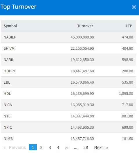 आज नबिल बैंकको प्रमोटर सेयरको सर्वाधिक कारोबार भएको छ । कम्पनीकाे यस दिन ५ करोड लाख रुपैयाँ बराबरको खरिदबिक्रि भएको छ । त्यस्तै, शिवम् सिमेन्ट्स, हिमाल दोलखा, एभरेष्ट बैंक, हिमालयन डिष्टिलरी, एनआईसी एशिया, एनटीसी, नेपाल पुनर्बीमा, नेपाल इन्भेष्टमेन्ट मेगा बैंकको सर्वाधिक कारोबार भएको छ।