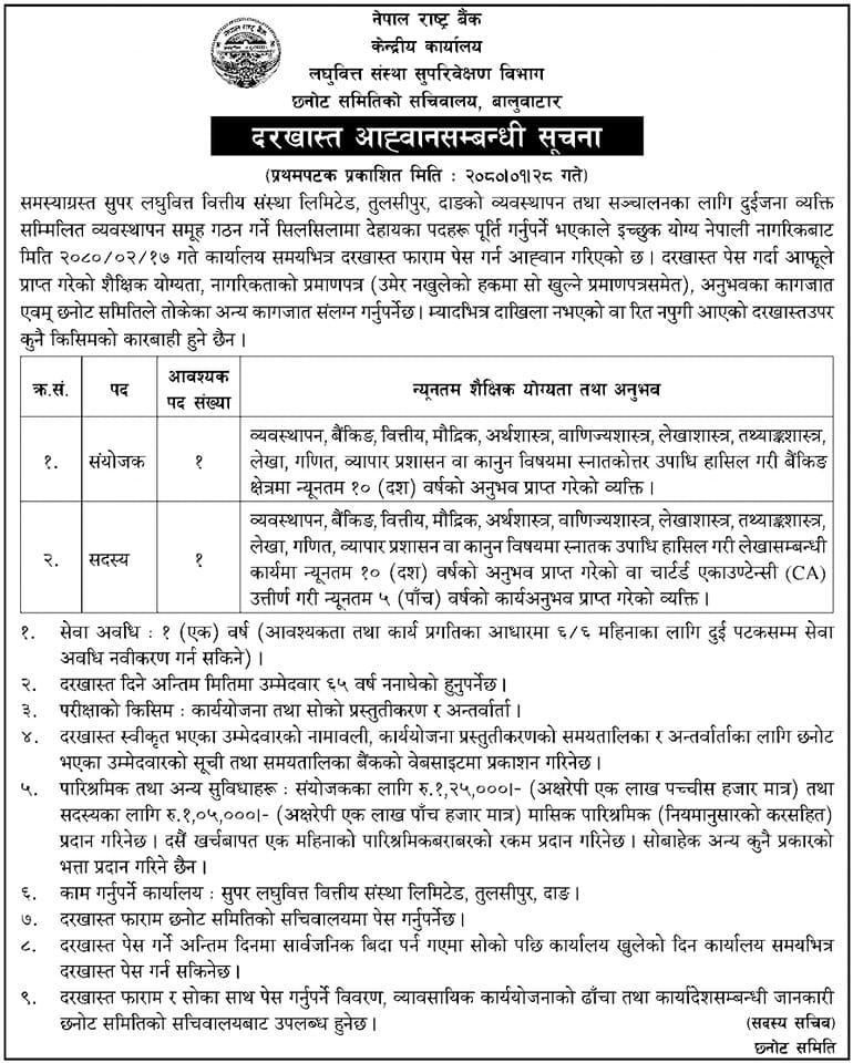 राष्ट्र बैंकद्वारा समस्याग्रस्त सुपर लघुवित्तकाे व्यवस्थापनका लागि संयोजक र सदस्यमा दरखास्त आह्वान