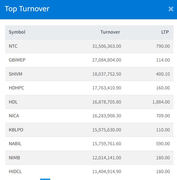 आज जम्मा ५७ करोड ८८लाख ४१ हजार बराबरकाे कारोबार भएको छ । आज नेपाल टेकिमको सर्वाधिक काराेबार भएकाे छ । कम्पनीकाे यस दिन ३ करोड १५ लाख रुपैयाँमाथिको कारोबार भएको छ । त्यस्तै, ग्लोबल आइएमई बैंकको संस्थापक शेयर २ करोड ७० लाख रुपैयाँ, शिवम् सिमेन्ट्सको १ करोड ८० लाख, हिमाल दोलखा हाइड्रोपावरको १ करोड ७७ लाख र हिमालयन डिष्टिलरीको १ करोड ६८ लाख रुपैयाँमाथिको कारोबार भएको छ ।