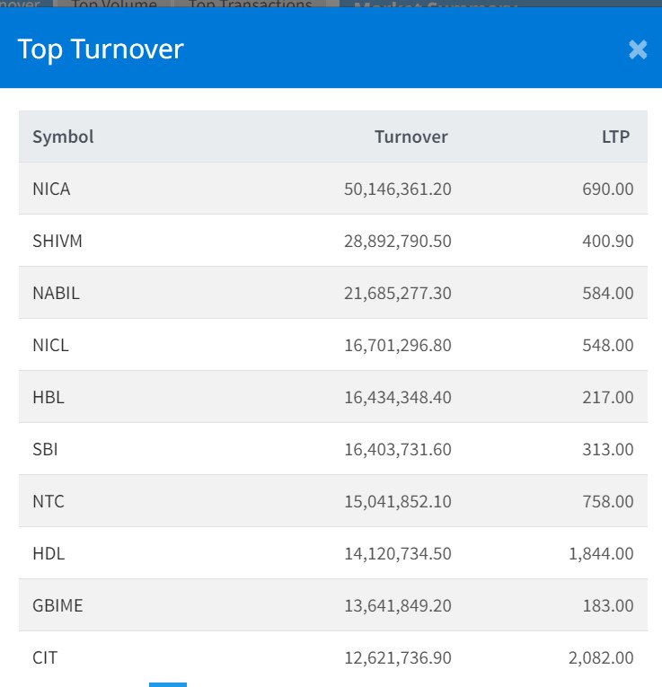 आज एनआइसी एशिया बैंकको सर्वाधिक काराेबार भएकाे छ । कम्पनीकाे ५ करोड एक लाख रुपैयाँमाथिको कारोबार भएको छ । त्यस्तै, शिवम् सिमेन्ट्सको २ करोड ८८ लाख रुपैयाँ, नबिल बैंकको २ करोड १६ लाख रुपैयाँ, हिमालयन बैंकको एक करोड ६४ लाख रुपैयाँ र नेपाल इन्स्योरेन्सको १ करोड ६४ लाख रुपैयाँमाथिको कारोबार भएको छ।