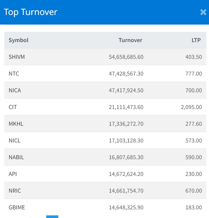 आज शिवम् सिमेन्ट्सको सर्वाधिक काराेबार भएकाे छ । कम्पनीकाे यस दिन ५ करोड ४४ लाख रुपैयाँमाथिको कारोबार भएको छ । त्यस्तै, नेपाल टेलिकमको ४ करोड ७४ लाख, एनआइसी एशिया बैंकको ४ करोड ७४ लाख, नागरिक लगानी कोषको २ करोड ११ लाख रुपैयाँ र माई खोला हाइड्रोपावरको १ करोड ७३ लाख रुपैयाँमाथिको कारोबार भएको छ ।
