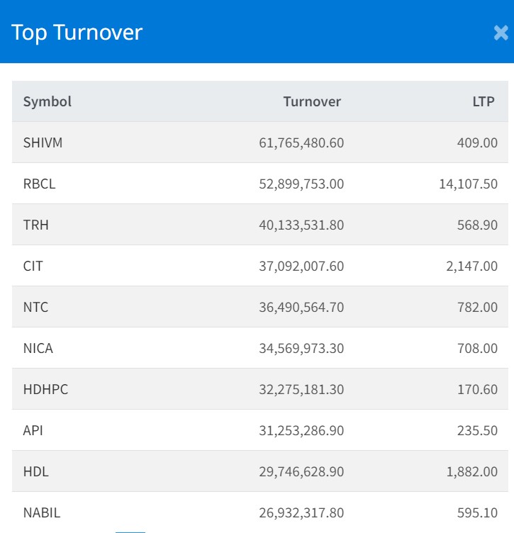 त्यस्तै, राष्ट्रिय बीमा कम्पनीको ५ करोड २८ लाख, तारागाउँ रिजेन्सी होटलको ४ करोड, नागरिक लगानी कोषको ३ करोड ७० लाख र नेपाल टेलिकमको ३ करोड ६३ लाख रुपैयाँमाथिको कारोबार भएको छ ।