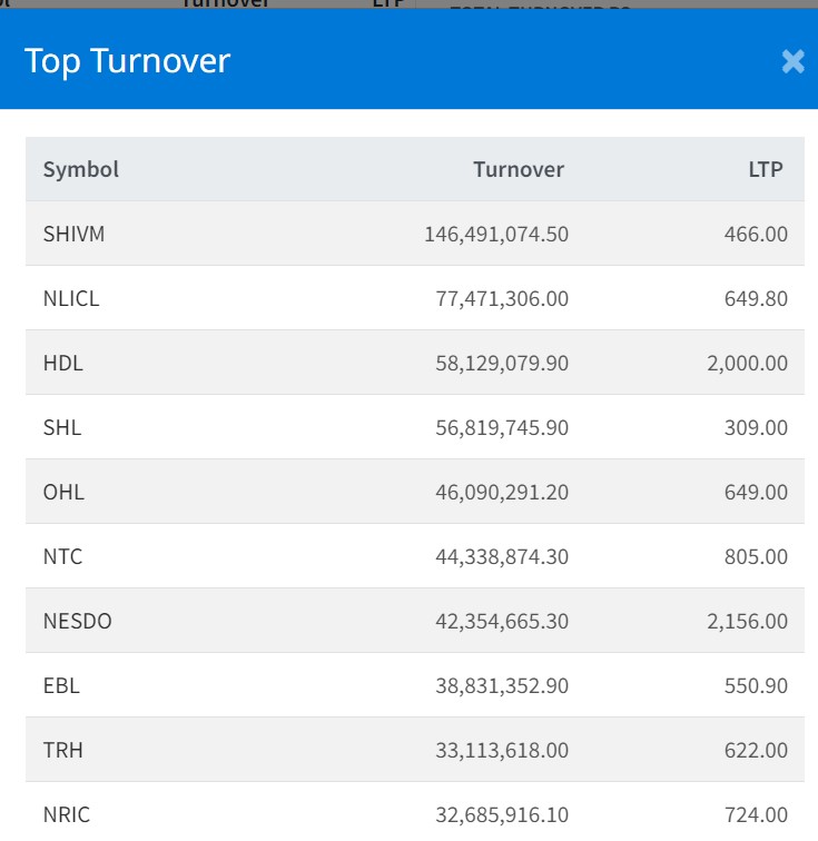 आज शिवम् सिमेन्ट्सको सर्वाधिक काराेबार भएकाे छ । कम्पनीकाे यस दिन १४ करोड ६४ लाख रुपैयाँमाथिको कारोबार भएको छ। त्यस्तै, नेशनल लाइफ इन्स्योरेन्सको ७ करोड ७४ लाख, हिमालयन डिष्टिलरीको ५ करोड ८१ लाख, सोल्टी होटलको ५ करोड ६८ लाख र ओरियन्टल होटलको ४ करोड ६० लाख रुपैयाँमाथिको कारोबार भएको छ।