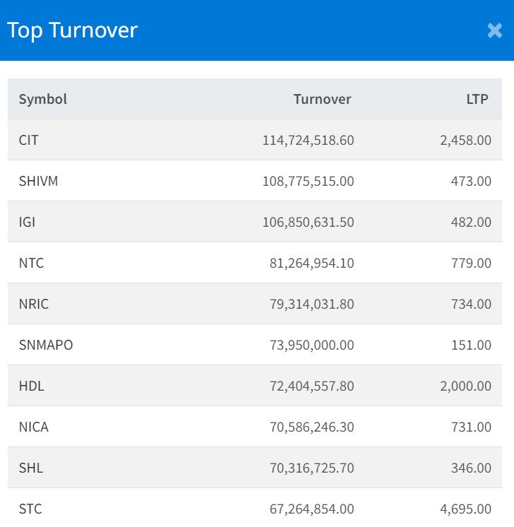 आज नागरिक लगानी कोषको सर्वाधिक काराेबार भएकाे छ । कम्पनीकाे यस दिन ११ करोड ३६ रुपैयाँमाथिको कारोबार भएको छ । त्यस्तै, आइजीआई प्रुडेन्सियल इन्स्योरेन्सको १० करोड ६२ लाख, शिवम् सिमेन्ट्सको १० करोड ३९ लाख, नेपाल टेलिकमको ८ करोड ११ लाख र नेपाल पुनर्बीमा कम्पनीको ७ करोड ९२ लाख रुपैयाँमाथिको कारोबार भएको छ ।