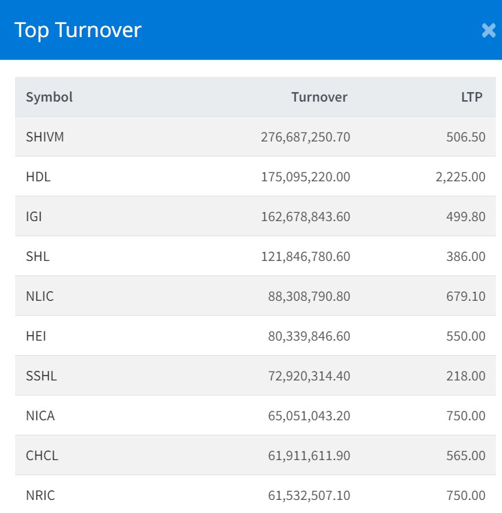 त्यस्तै, हिमालयन डिष्टिलरीको १७ करोड ४६ लाख, आइजीआई प्रुडेन्सियल इन्स्योरेन्सको १६ करोड २६ लाख, सोल्टी होटल लिमिटेडको १२ करोड १६ लाख र नेपाल लाइफ इन्स्योरेन्सको ८ करोड ८२ लाख रुपैयाँमाथिको कारोबार भएको छ ।