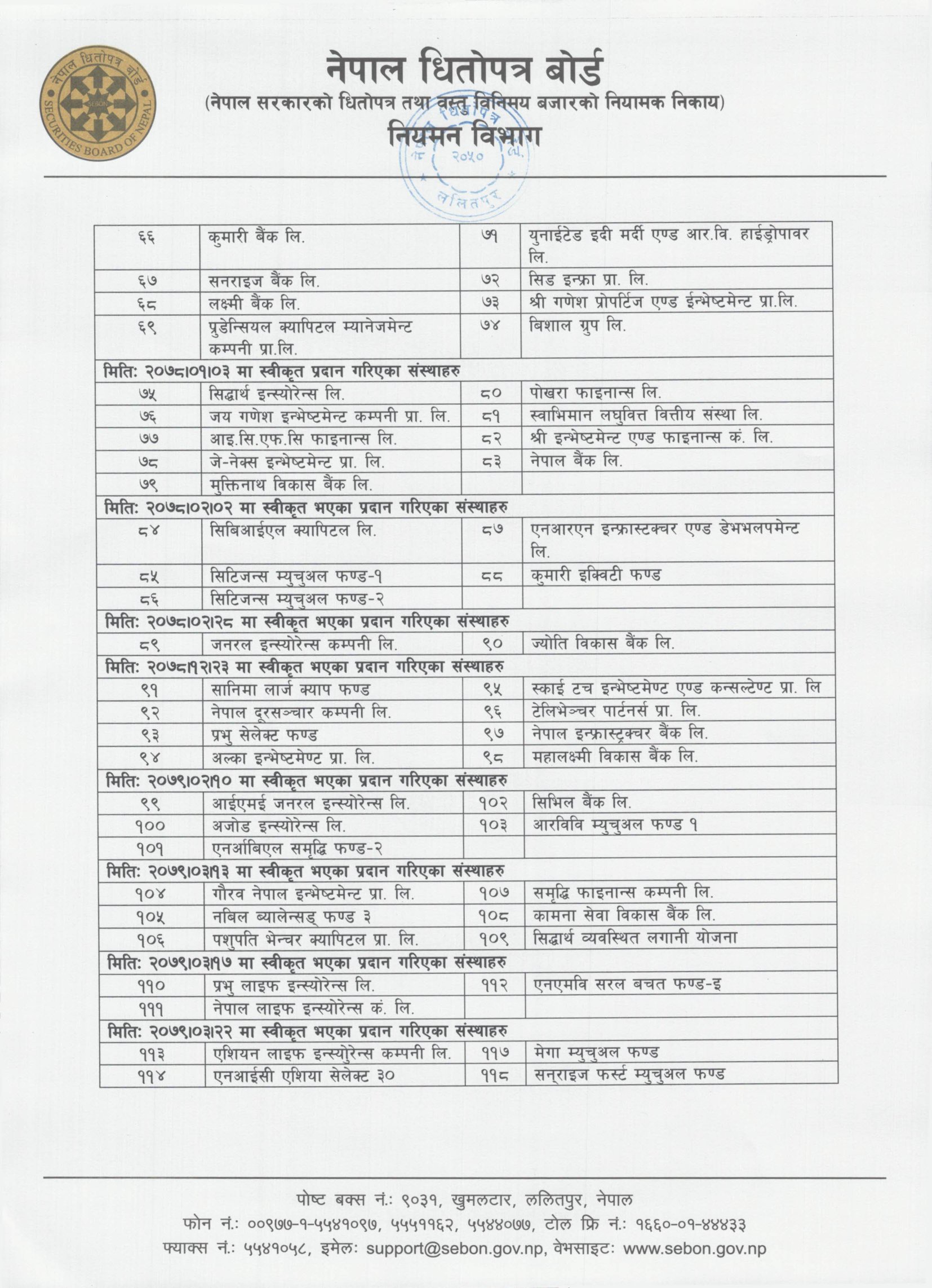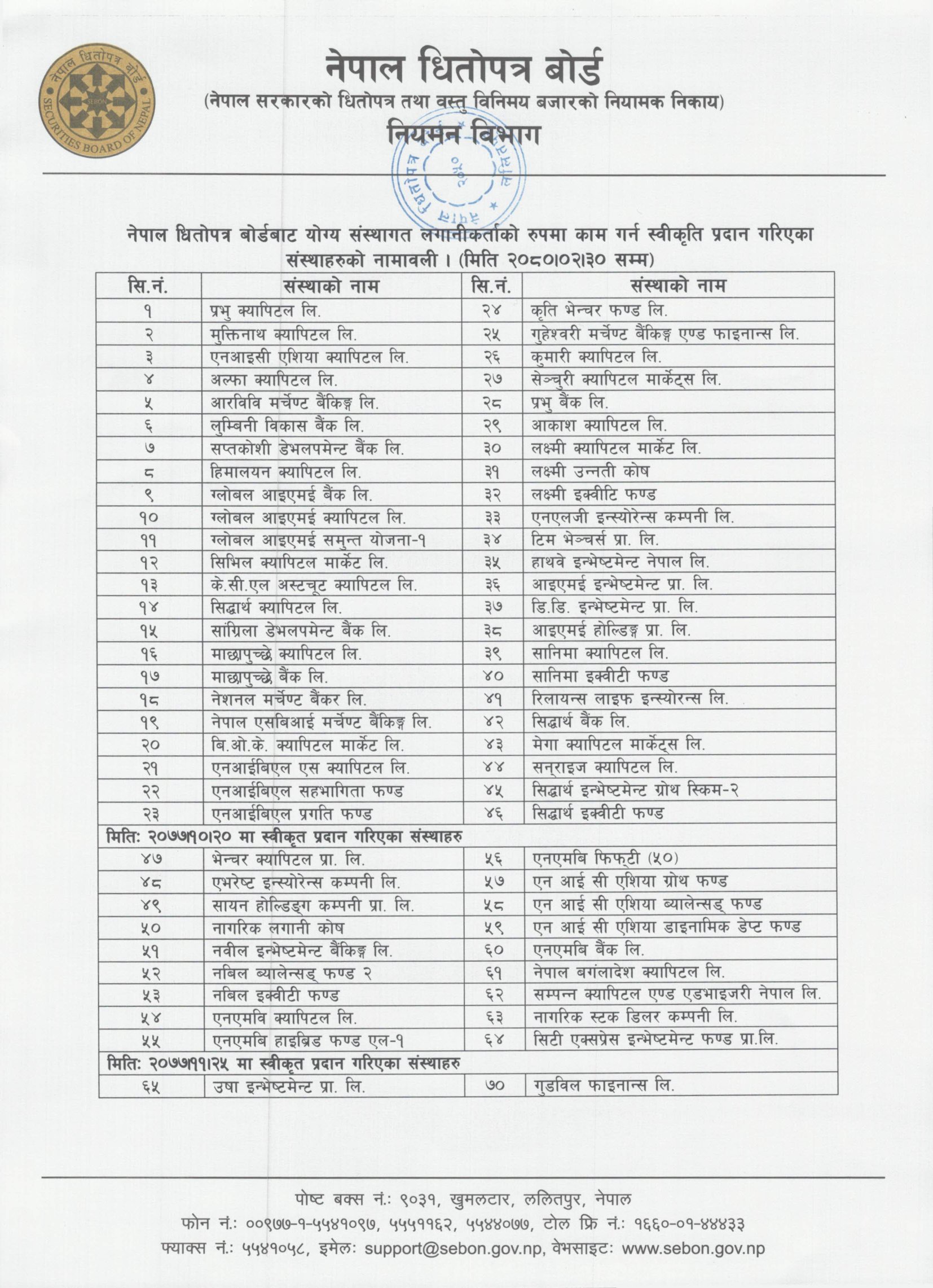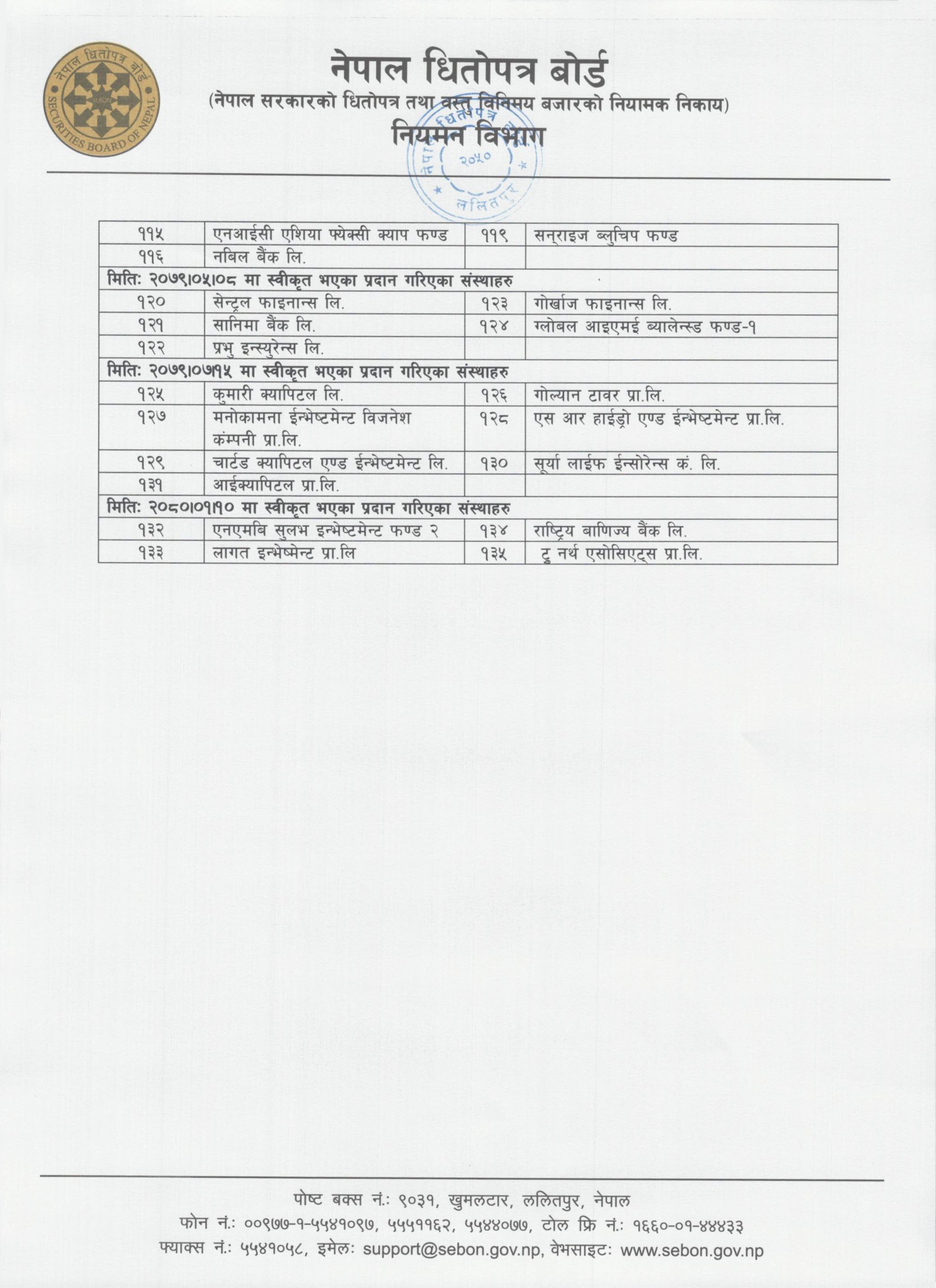बोर्डले एनएमबि सुलभ इन्भेष्टमेन्ट फण्ड–२, लागत इन्भेष्टमेन्ट प्रालि, राष्ट्रिय वाणिज्य बैंक र टु नर्थ एसोसिएट्स प्रालिलाई स्वीकृति दिएको छ ।