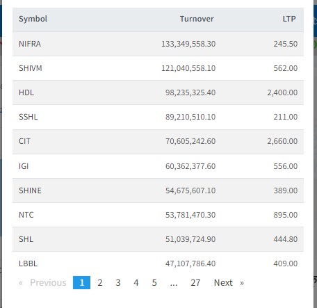 आज निफ्राकाे सेयर सर्वाधिक काराेबार भएकाे छ । यस दिन कम्पनीकाे २० करोड ५७ लाख रुपैयाँ बराबरको सेयर कारोबार भएको छ। शिवम् सिमेन्ट्सको पनि १९ करोड बढीकाे सेयर कारोबार भएको छ । त्यस्तै, हिमालयन डिष्टलरी, आईजीआई प्रुडेन्सियल, शिव श्री हाईड्रोपावर, नेपाल लाइफ, सिआईटी, सोल्टि होटल, नेपाल टेलिकम र सूर्या ज्योतिको सेयर सर्वाधिक खरिदबिक्रि भएको छ।