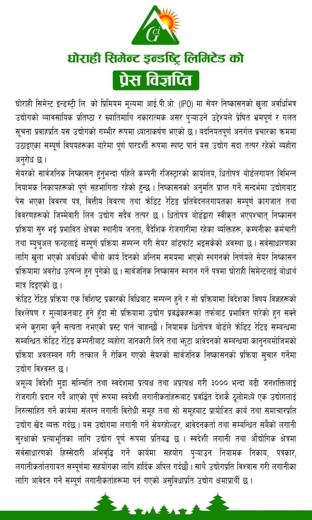 ८ असार, काठमाडौं । सगरमाथा सिमेन्ट उत्पादन गर्दै आएको घोराही सिमेन्ट इन्डस्ट्री लिमिटेडले कम्पनीले प्रिमियम मूल्यमा आईपीओ सेयर निष्काशनको खुला अवधिभित्र उद्योगको व्यावसायिक प्रतिष्ठा र ख्यातिमाथि नकारात्मक असर पुयाउने भ्रमपूर्ण र गलत सूचना निकालिएको भन्दै कमजोरी लुकाउने प्रयास गरेको छ ।