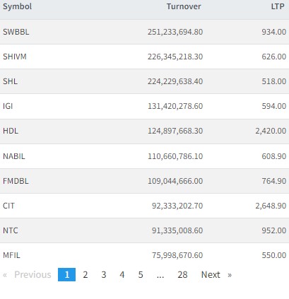 आज स्वालम्वन लघुवित्तको सर्वाधिक कारोबार भएको छ। कम्पनीको आज २५ करोड १२ लाख रुपैयाँ बराबरको सेयर कारोबार भएको छ।त्यस्तै, सोल्टि होटल, शिवम् सिमेन्टस्, आईजीआई पु्रडेन्सियल, हिमालयन डिष्टलरी, नबिल बैंक, फस्र्ट माईक्रोफाइनान्स, नागरिक लगानी कोष, मञ्जुश्री फाइनान्स, नेपाल टेलिकमको सर्वाधिक कारोबार भएको छ।
