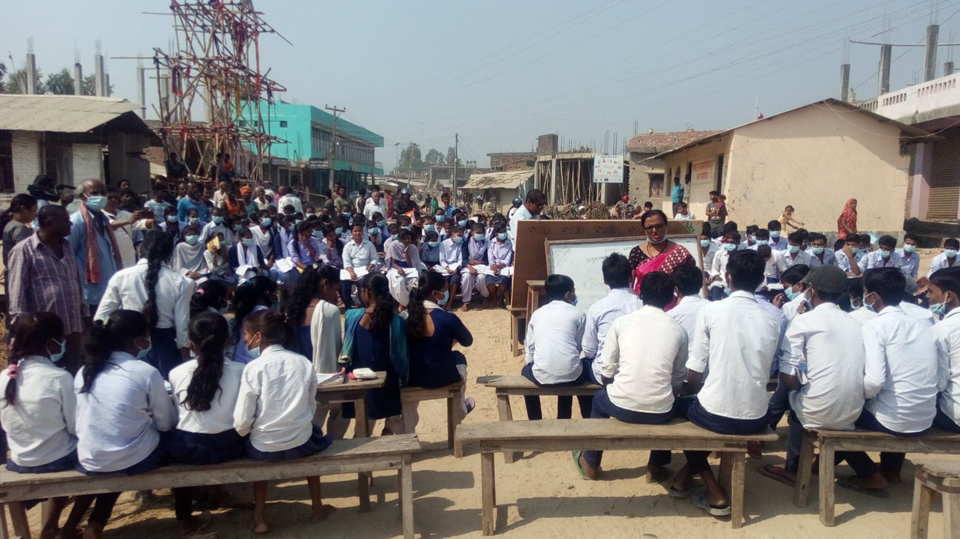८ कात्तिक, धनुषा । वडा अध्यक्षले नै सडक विस्तारको नाममा विद्यालयको भवन भत्काइदिएपछि धनुषाका एक विद्यालयका विद्यार्थीले सडकमै बसेर पढेका छन । सडक विस्तारको क्रममा वडाध्यक्षले सामुदायिक विद्यालय भनव भत्काएको विरोधमा विद्यार्थीहरु सडकमै बसेर पढेका हुन । जनकपुरधाम उपमहानगरपालिका –२१, कुर्थामा रहेको राजर्षी जनक उच्च माध्यमिक विद्यालयका विद्यार्थीहरु बिहीबार विरोधस्वरुप सडकमै बसेर पढे ।