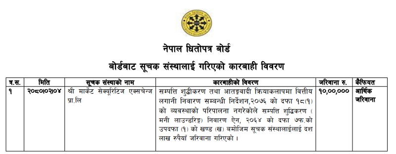 मार्केट सेक्युरिटिजमाथि धितोपत्र बोर्डले सम्पत्ति शुद्धीकरण निवारण ऐन, २०६४ को दफा ७ को उपदफा (१)को खण्ड (ख)बमोजिम कारबाही गर्दै १० लाख रुपैयाँ जरिवाना गरेकाे छ ।