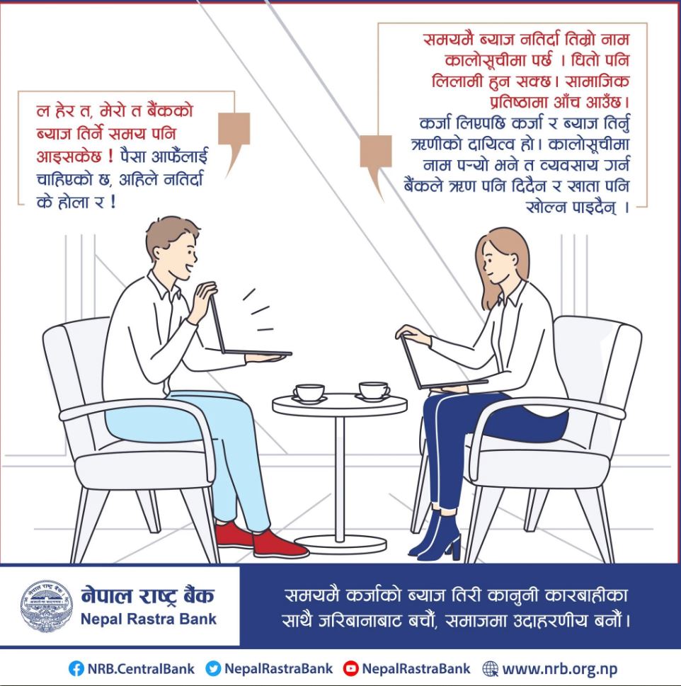 राष्ट्र बैंकले आज सूचना जारी गर्दै समयमै कर्जाको सावाँ ब्याज भुक्तानी गर्न र सामाजिक प्रष्ठिासहित जरिवाना, कारबाहीबाट बच्न अनुरोध गरेको हो । साथै, राष्ट्र बैंकले संवादमूलक सूचनामार्फत ऋण तिर्न आग्रह गरेको छ ।