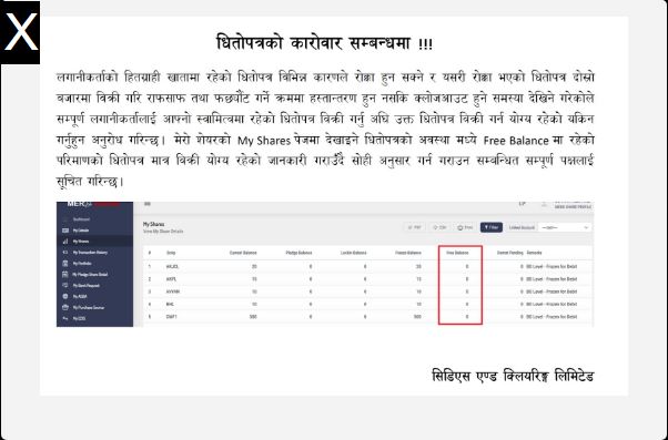 ‘मेरो सेयरको ‘माई सेयर्स’ पेजमा देखाइने धितोपत्रको अवस्थामध्ये ‘फ्री ब्यालेन्स’मा रहेको परिमाणको धितोपत्रमात्र बिक्रीयोग्य रहेको हुन्छ’, सूचनामा भनिएको छ।