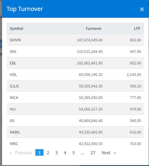आज सेयर बजारमा गिरावट आउँदा सबैभन्दा बढी शिवम् सिमेन्ट्सको कारोबार भएको छ । आज कम्पनीको १४ करोड ७८ लाख ७४ हजार रुपैया बराबरको कारोबार भएको छ । त्यस्तै, सोल्टी होटलको ११ करोड ९९ लाख १५ हजार रुपैयाँ, एभरेष्ट बैंकको १० करोड २० लाख ६२ हजार रुपैयाँ, हिमालयन डिस्टीलरीको ६ करोड ५ लाख ९८ हजार रुपैयाँ र सूर्यज्योति लाइफ इन्स्योरेन्सको ५ करोड ९५ लाख ५ हजार रुपैयाँको कारोबार भएको हो ।