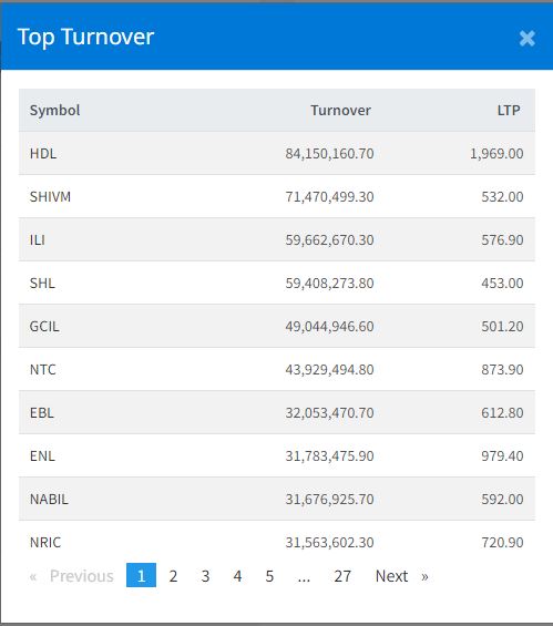 आज सेयर बजारमा गिरावट आउँदा हिमालयन डिस्टीलरीको सर्वाधिक कारोबार भएको छ । यस दिन कम्पनीको ८ करोड ३९ लाख ९२ हजार रुपैया बराबरको कारोबार भएको छ । त्यस्तै, शिवम् सिमेन्ट्सको ७ करोड १ लाख ५७ हजार रुपैयाँ,आइएमई लाइफ इन्स्योरेन्सको ५ करोड ९५ लाख १२ हजार रुपैयाँ, सोल्टी होटलको ५ करोड ९२ लाख २७ हजार रुपैयाँ र घोराही सिमेन्ट इन्डस्ट्रीको ४ करोड ९० लाख ४ हजार रुपैयाँको कारोबार भएको हो ।