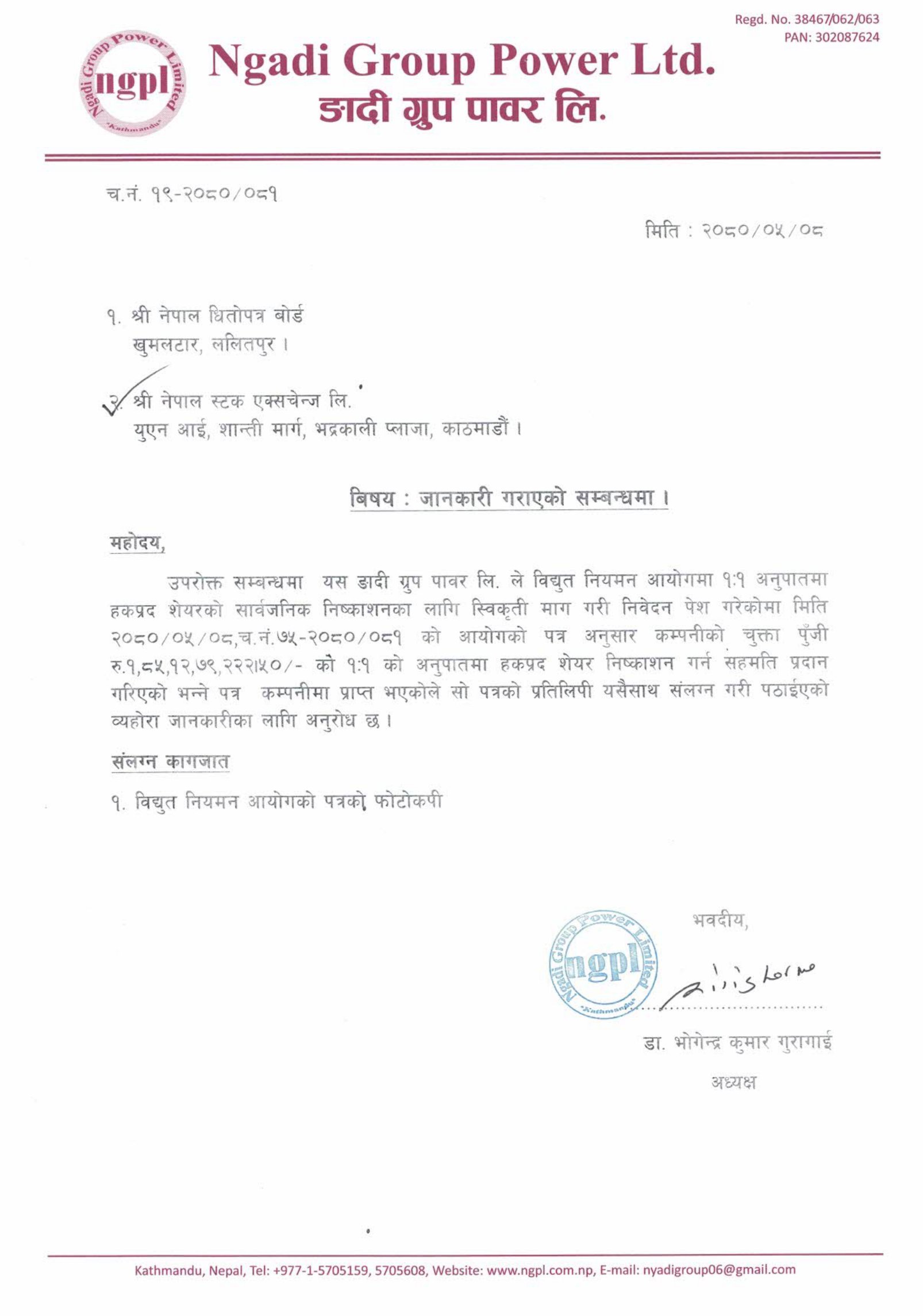 त्यस्तै, आयोगले ङादी ग्रुप पावरलाई हाल कायम चुक्ता पूँजीकाे १:१ काे अनुपातमा १०० प्रतिशत हकप्रद निष्कासन गर्न स्वीकृति दिएको हाे । हाल कम्पनीकाे चुक्ता पुँजी १ अर्ब ८५ करोड १२ लाख ७९ हजार २०० रुपैयाँ रहेको छ । १०० प्रतिशत हकप्रद सेयर जारी गरेपछि कम्पनीकाे चुक्ता पुँजी ३ अर्ब ७० करोड २५ लाख ५८ हजार रुपैयाँ पुग्नेछ ।