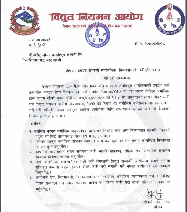 आयोगले आँखुखोला जलविद्युत कम्पनीलाई १५० प्रतिशत हकप्रद सेयर निष्कासन गर्न स्वीकृति दिएको छ । कम्पनीलाई ८० करोड रुपैयाँको १ः.१.५ अनुपातमा अर्थात १५० प्रतिशत हकप्रद सेयर जारी गर्न स्वीकृति दिएको हाे ।