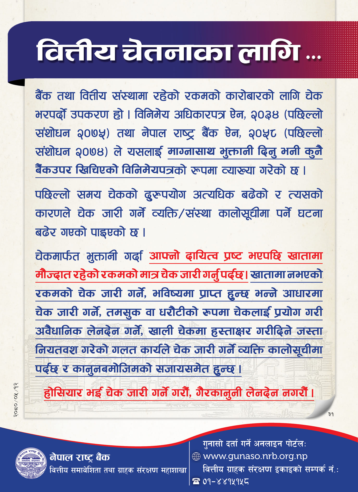 १२ साउन, काठमाडाैं । नेपाल राष्ट्र बैंकले होसियार भई चेक जारी गर्न आग्रह गरेको छ । वित्तीय चेतनाका लागि केन्द्रीय बैंकले आज एक सूचना प्रकाशित गरी यस्तो आग्रह गरेको हो। ‘होसियार भई चेक जारी गर्ने गरौँ’, सूचनामा भनिएको छ, ‘गैरकानुनी लेनदेन नगरौँ।’