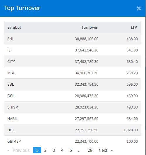 आज सेयर बजारमा गिरावट आउँदा सोल्टी होटलको सर्वाधिक कारोबार भएको छ । कम्पनीको यस दिन ३ करोड ८८ लाख ८८ हजार रुपैँया बराबरको कारोबार भएको छ । त्यस्तै, आइएमई लाइफ इन्स्योरेन्सको ३ करोड ७६ लाख ४१ हजार रुपैयाँ, सिटी होटलको ३ करोड ७४ लाख २ हजार रुपैयाँ, माछापुच्छ्रे बैंकको ३ करोड ४९ लाख ६६ हजार रुपैयाँ र एभरेष्ट बैंकको ३ करोड २३ लाख ४३ हजार रुपैयाँको कारोबार भएको हो ।