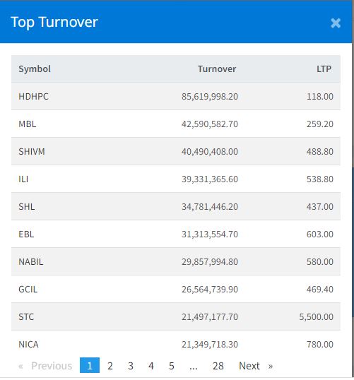 आज सेयर बजारमा सुधार आउँदा हिमाल दोलखा हाइड्रोपावरको सर्वाधिक कारोबार भएको छ । आज कम्पनीको ८ करोड ५६ लाख १९ हजार रुपैया बराबरको कारोबार भएको छ । त्यस्तै, माछापुच्छ्र्रे बैंकको ४ करोड २५ लाख ९० हजार रुपैयाँ, शिवम् सिमेन्टको ४ करोड ४ लाख ९० हजार रुपैयाँ, आइएमई लाइफ इन्स्योरेन्सको ३ करोड ९३ लाख ३१ हजार रुपैयाँ र सोल्टी होटलको ३ करोड ४७ लाख ८१ हजार रुपैयाँको कारोबार भएको हो ।