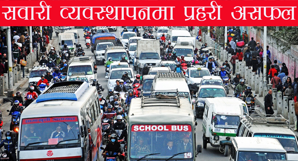 महानगरीय ट्राफिक प्रहरी महाशाखाका अनुसार पछिल्ला समयमा अत्याधिक रुपमा निजी सवारी भित्रिएको र देशका ७७ वटै जिल्लाबाट गाडी काठमाडाैँमा आउने र बाहिर दर्ता भएका सवारीसाधन समेत काठमाडौँमै चल्ने हुँदा ट्राफिक व्यवस्थापन थप जटिल बन्ने गरेको छ ।