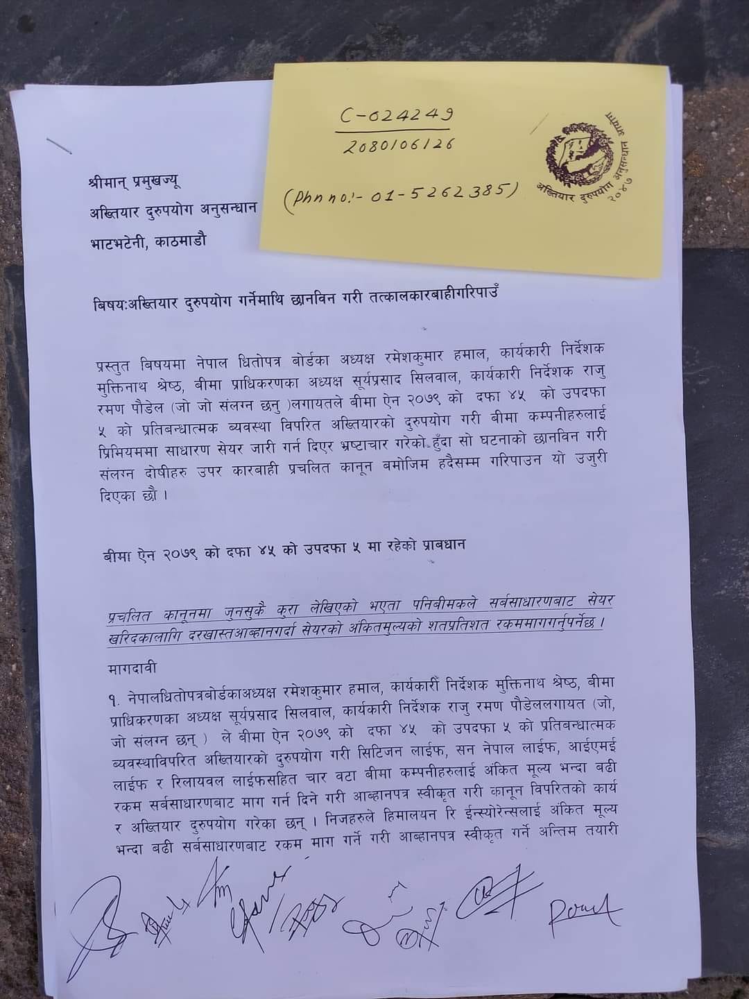 प्रस्तुत बिषयमा नेपाल धितोपत्र बोर्डका अध्यक्ष रमेशकुमार हमाल, कार्यकारी निर्देशक मुक्तिनाथ श्रेष्ठ, बीमा प्राधिकरणका अध्यक्ष सूर्यप्रसाद सिलवाल, कार्यकारी निर्देशक राजु रमण पौडेल (जो जो संलग्न छन्) लगायतले बीमा ऐन २०७९ को  दफा ४५  को उपदफा ५ को प्रतिबन्धात्मक ब्यवस्था विपरित अख्तियारको दुरुपयोग गरी बीमा कम्पनीहरुलाई प्रिमियममा साधारण सेयर जारी गर्न दिएर भ्रष्टाचार गरेको हुँदा सो घटनाको छानविन गरी संलग्न दोषीहरु उपर कारबाही प्रचलित कानून बमोजिम हदैसम्म गरिपाउन यो उजुरी दिएका छौ ।