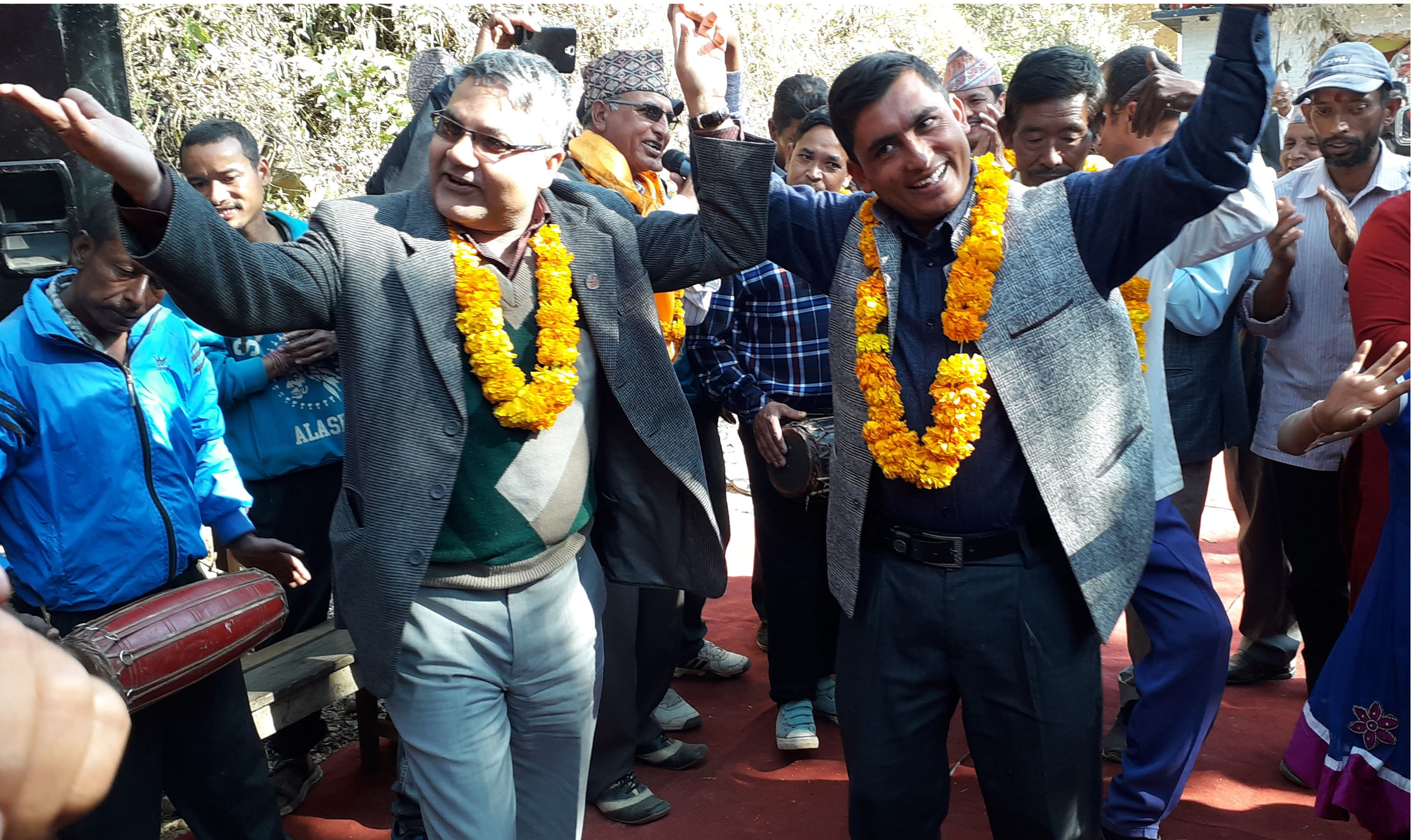 नेपाल कम्युनिष्ट पार्टी (नेकपा) पनौती नगरपालिका ११ वडा कमिटिद्वारा बुधबार बल्थलीमा आयोजित शुभकामना, भेटघाट एवं देउसीभैलो कार्यक्रममा नाच्दै सञ्चार तथा सूचना प्रविधिमन्त्री गोकुलप्रसाद बाँस्कोटा । तस्बिरः राजकुमार पराजुली, काभे्रपलाञ्चोक, रासस