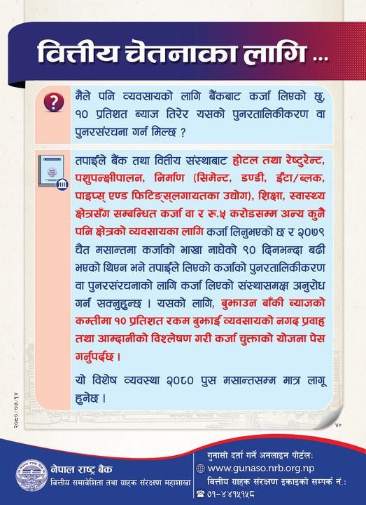 कसैले बैंक तथा वित्तीय संस्थाबाट होटेल तथा रेस्टुरेन्ट, पशुपन्छीपालन, निर्माण (सिमेन्ट, डन्डी, इँटा–ब्लक, पाइप्स् एन्ड फिटिङ्सलगायतका उद्योग), शिक्षा, स्वास्थ्य क्षेत्रसँग सम्बन्धित कर्जा वा रु. ५ करोडसम्म अन्य कुनै पनि क्षेत्रको व्यवसायका लागि कर्जा लिएको भए र २०७९ चैत मसान्तमा कर्जाको भाखा नाघेको ९० दिनभन्दा बढी भएको थिएन भने लिएको कर्जाको पुनरतालिकीकरण वा पुनरसंरचनाका लागि कर्जा लिएको संस्थासमक्ष अनुरोध गर्न सकिने व्यवस्था रहेको राष्ट्र बैंकले जनाएको छ।