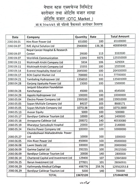 १४ कात्तिक, काठमाडाैं । चालु आर्थिक वर्षको पहिलो त्रैमासमा ओभर दी काउन्टर (ओटीसी) बजारमा १ अर्ब ७१ करोड बढीको कारोबार भएको छ। नेपाल स्टक एक्सचेन्ज (नेप्से)ले जारी गरेको तथ्यांकअनुसार पहिलो त्रैमासमा ओटीसी बजारमा विभिन्न कम्पनीका कुल १ अर्ब ७१ करोड ६ लाख ६८ हजार ७४० रुपैयाँ बराबरको १ करोड ३६ लाख ७२ हजार १२० कित्ता सेयर किनबेच भएका छन्।