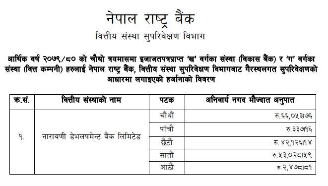 केन्द्रीय बैंकले नारायणी डेभलपमेन्ट बैंकलाई चौंथौ पटकमा रू ६६,०५३।७६, पाँचौं पटकमा रू ३३७।१६, छैटौं पटकमा रू ४२,१२६।१४, सातौं पटकमा रू ५३,०२८।५९ र आठौं पटकमा रू २,४७८।८१ गरी १ लाख ६४ हजार २४।४५ रुपैयाँ नगद जरिवाना गरेको हो ।