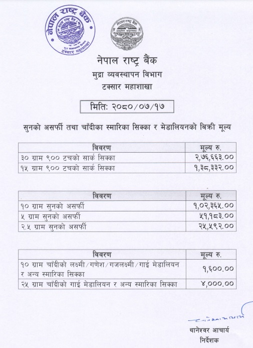 यस्ताे छ सुनको असर्फी तथा चाँदीका स्मारिका सिक्का र मेडालियनको बिक्री मूल्यः