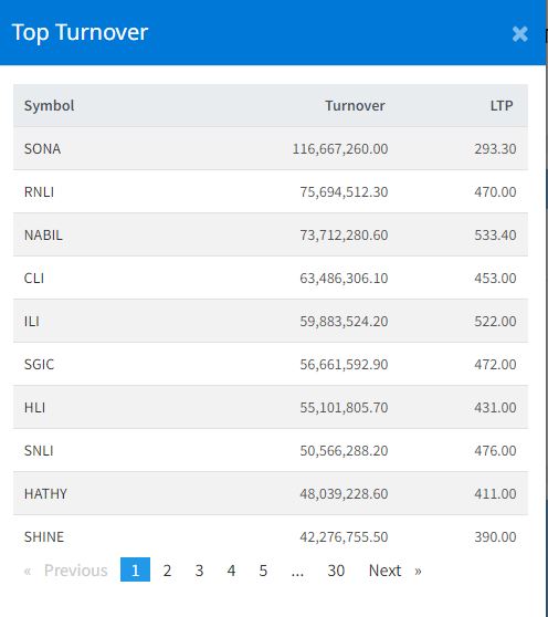 आज सेयर बजारमा सुधार आउँदा सोनापुर मिनरल्सको सर्वाधिक कारोबार भएको छ । कम्पनीको यस दिन ११ करोड ६६ लाख ६७ हजार रुपैया बराबरको कारोबार भएको छ । त्यस्तै, रिलायबल नेपाल लाइफ इन्स्योरेन्सको ७ करोड ५६ लाख ९४ हजार रुपैयाँ, नबिल बैंकको ७ करोड ३७ लाख १२ हजार रुपैयाँ, सिटिजन लाइफ इन्स्योरेन्सको ६ करोड ३४ लाख ८६ हजार रुपैयाँ र आइएमई लाइफ इन्स्योरेन्सको ५ करोड ९८ लाख ८३ हजार रुपैयाँको कारोबार भएको हो ।