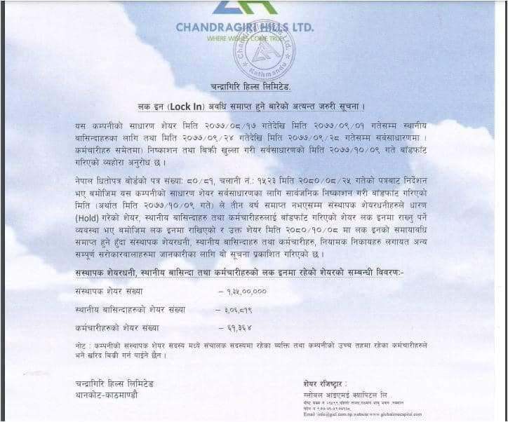 ६ पुस, काठमाडौं । चन्द्रागिरी हिल्स लिमिटेडको संस्थापक सेयर, स्थानीय बासिन्दा र कर्मचारीलाई बाँडफाँड भएको सेयरको ‘लक इन’ अवधि माघ ८ गते सकिने भएको छ ।