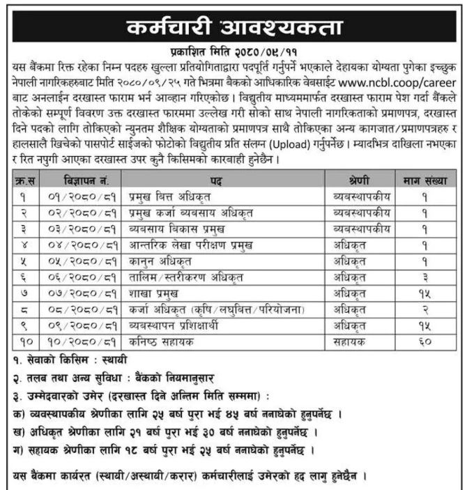 बैंकले सूचना सार्वजनिक गर्दै कनिष्ठ सहायक पदको लागि सबैभन्दा धेरै ६० जना, व्यवस्थापन प्रशिक्षार्थी र शाखा प्रमुख १५/१५ जना, तालिम स्तरीकण अधिकृत ३ जना, कर्जा अधिकृत २ जना र कर्मचारिको लागि कर्मचारिको माग गरेको हाे ।