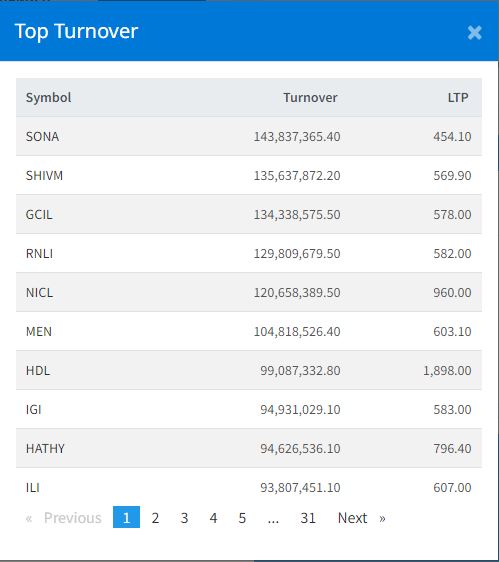 सेयर बजारमा गिरावट आएपनि यस दिन सोनापुर मिनरल्सको सर्वाधिक कारोबार भएको छ । आज कम्पनीको १४ करोड ३८ लाख ३७ हजार रुपैया बराबरको कारोबार भएको छ । त्यस्तै, शिवम् सिमेन्टको १३ करोड ५६ लाख ३७ हजार हजार रुपैयाँ, घोराही सिमेन्ट इन्डस्ट्रीको १३ करोड ४३ लाख ३८ हजार रुपैयाँ, रिलायबल नेपाल लाइफ इन्स्योरेन्सको १२ करोड ९८ लाख ९ हजार रुपैयाँ र नेपाल इन्स्योरेन्सको १२ करोड ६ लाख ५८ हजार रुपैयाँको कारोबार भएको हो ।